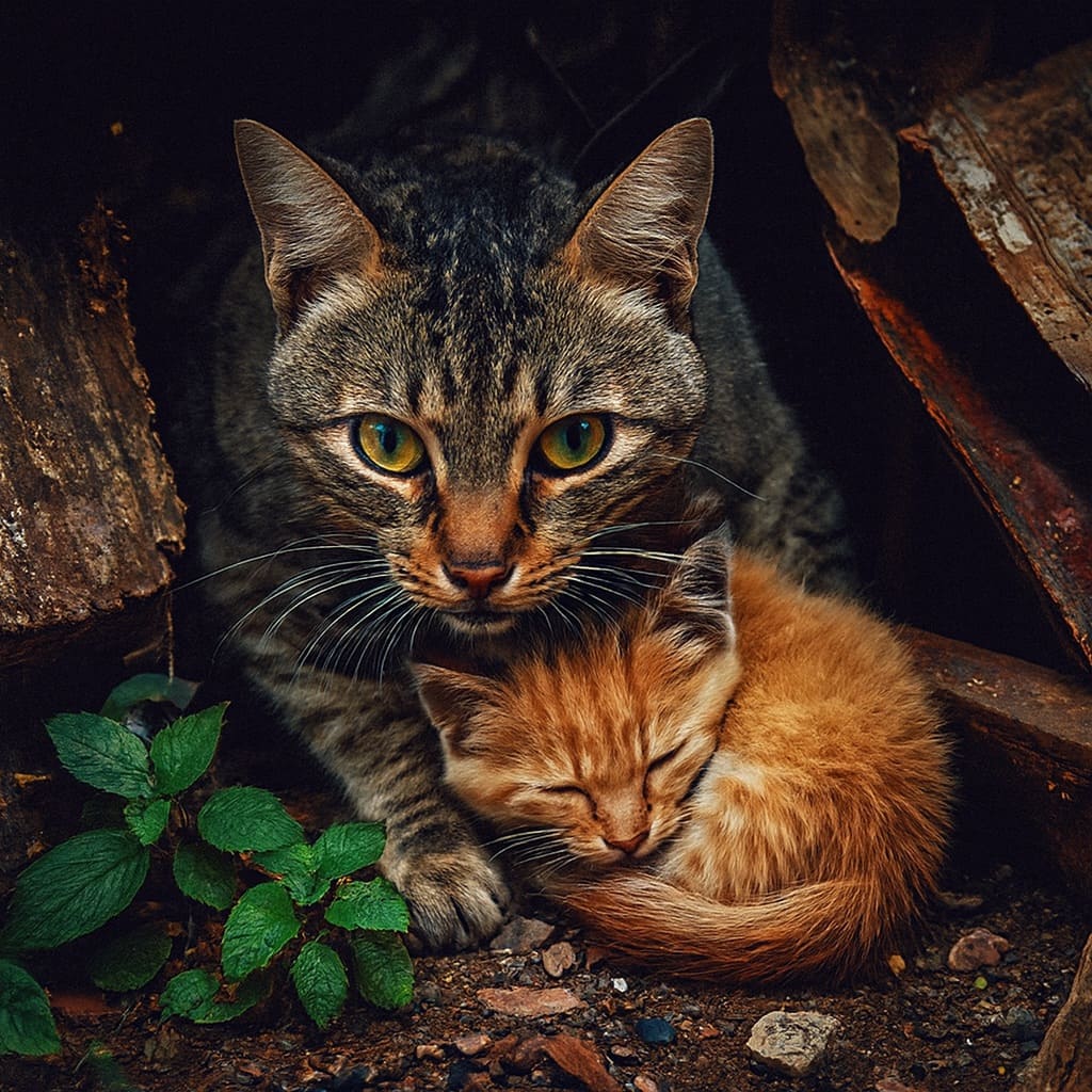 Когда она подошла к семейству, Бомка узнал её и приветливо мяукнул, а кошка-мама зашипела и прикрыла собой своих котят.