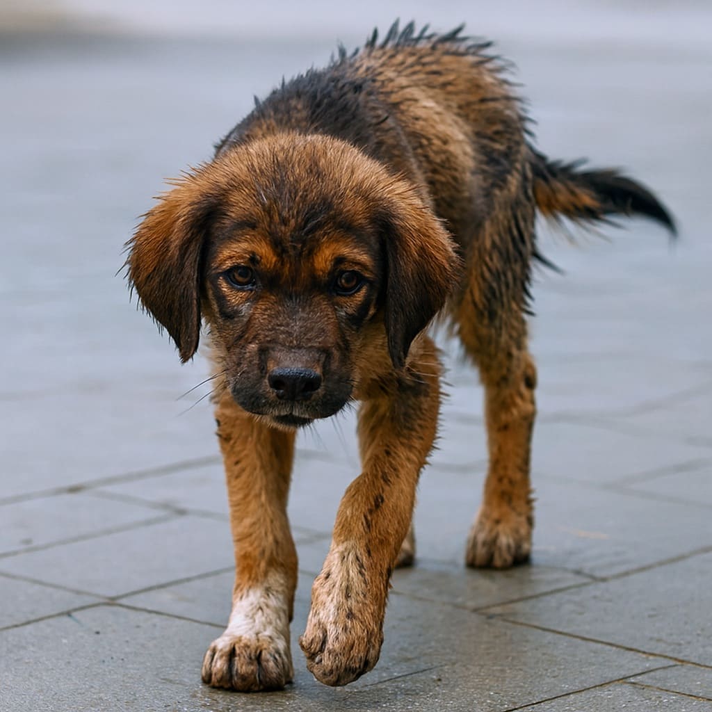 Он зашёл за угол и тут услышал, как кто-то тихо скулит. Парень присмотрелся. В кустах сидел грязный и лохматый щенок.