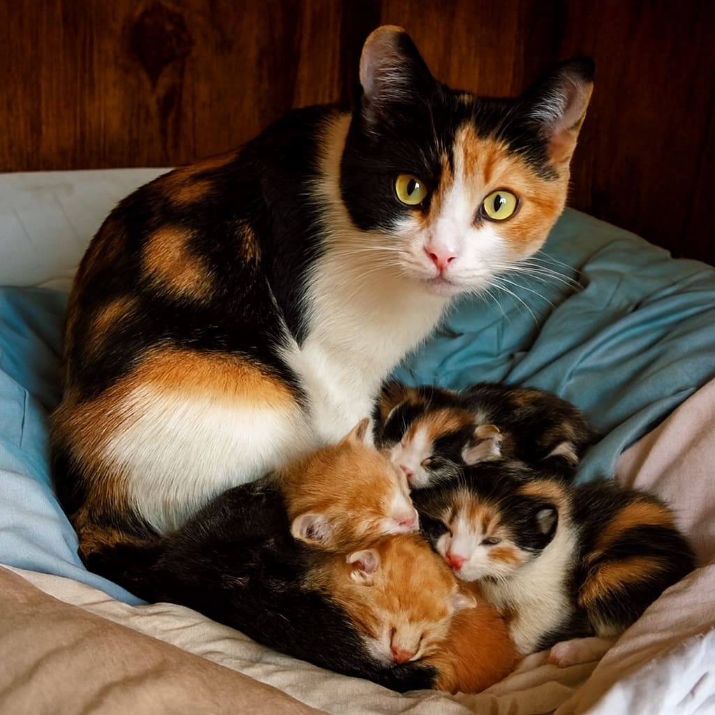 Отметив, что и в этом помёте есть одна «черепашка», Ирина перенесла мамашу с котятами в лукошко. Стоит ли говорить, что не прошло и часа, как всё Грушино семейство снова оказалось у бабушки в кровати.