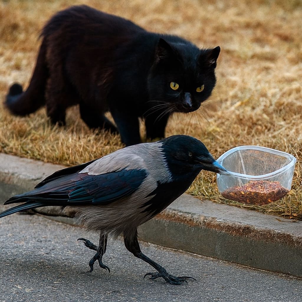 Следующим утром во дворе послышалось громкое и требовательное «Кра-кра-зя-зя-бра-бра-кра». Чёрный кот и молодой воронёнок требовали завтрак.