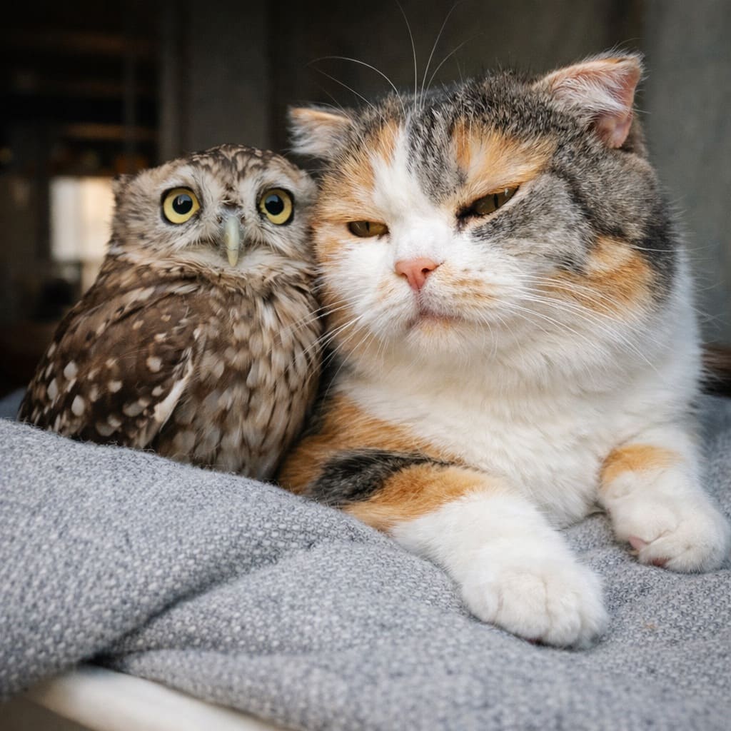 Тёпа ходил по полу и жалобно орал, пока пушистый малыш не спускался к нему на пол. Спали они теперь тоже вместе. Совёнок выяснил, что кошачий живот — это очень тёплое место…