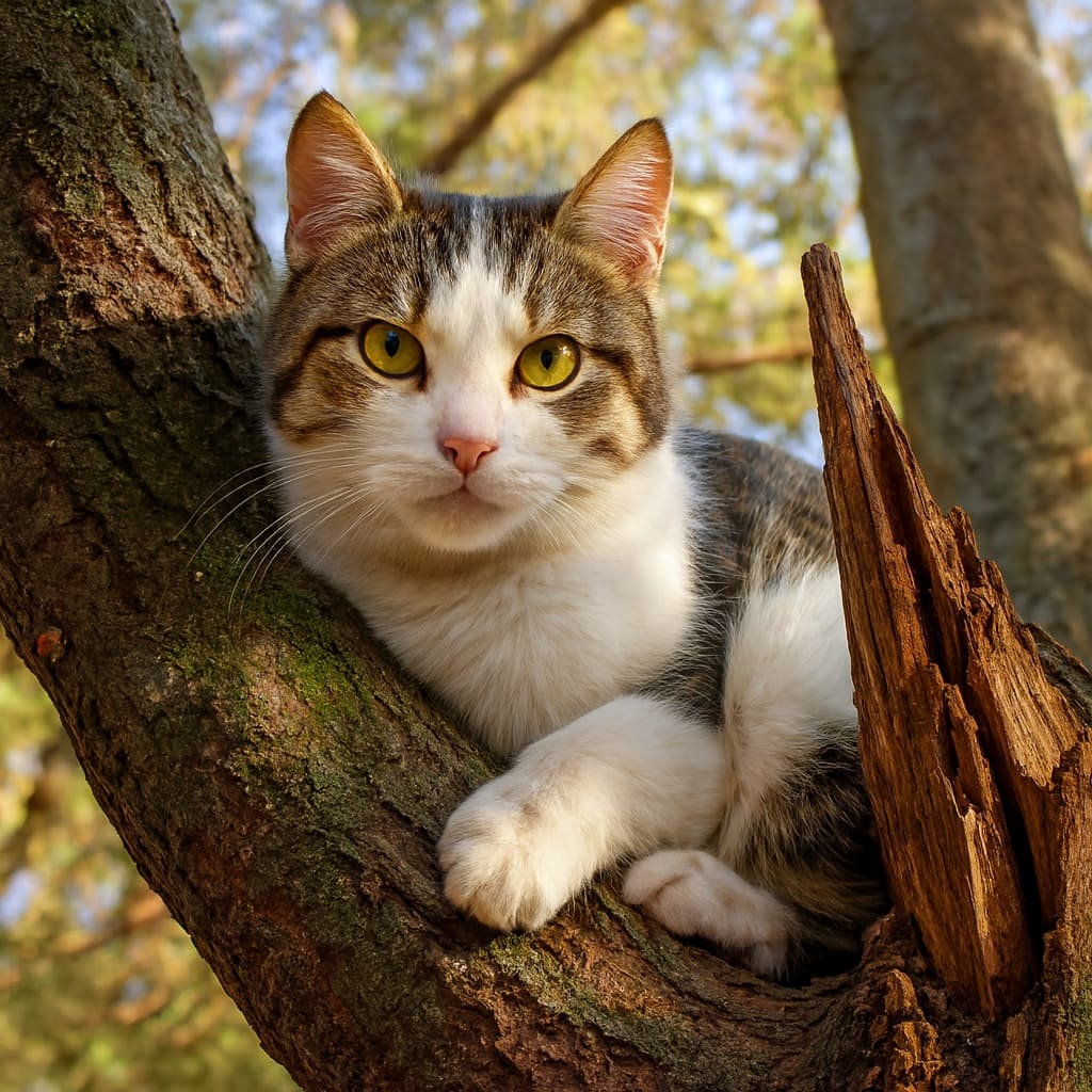 В магазине, благодаря благодетельницам, кошка находилась в часы его работы, а на ночь оставалась на улице. Чтобы не стать добычей для развлечения бездомных собак, забредавших к этой торговой точке в поисках съестного, кошка ночевала на стоящем рядом старом дереве. Кошка знала, что собаки не умеют лазить по деревьям.