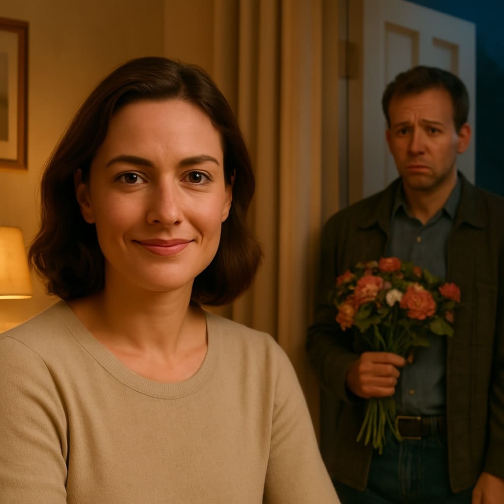 За дверью стоял Евгений. С огромным букетом белых роз и с таким виноватым видом, что невольно хотелось его пожалеть. На нём был новый костюм, галстук, дорогой одеколон — запах чувствовался издалека.