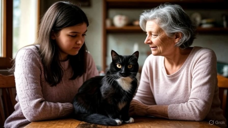 В углу кухни, на своей любимой подушке, развалилась чёрно-белая кошка Маруся. Она наблюдала за происходящим жёлтыми глазами, изредка переводя взгляд с матери на дочь и обратно.