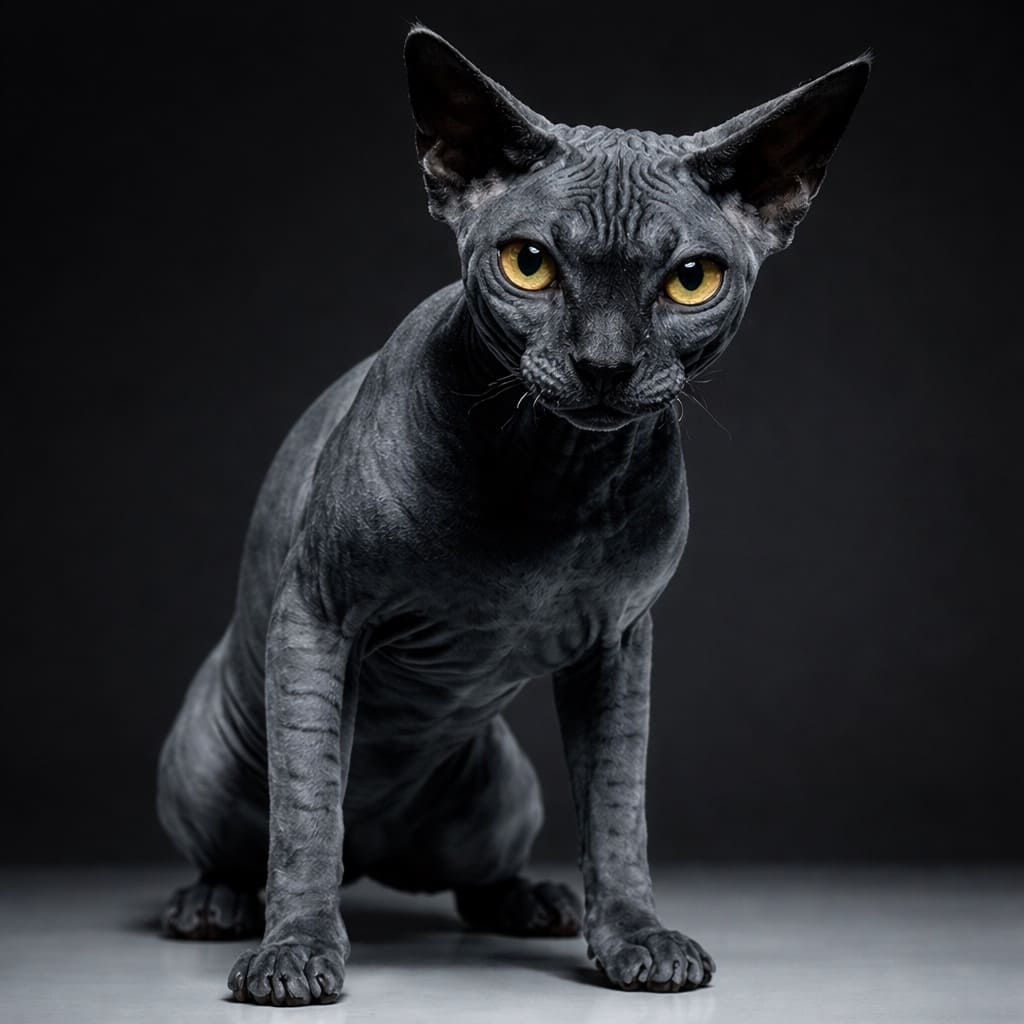 Лысая красавица породы донской сфинкс прищурила свои зелёные глаза: