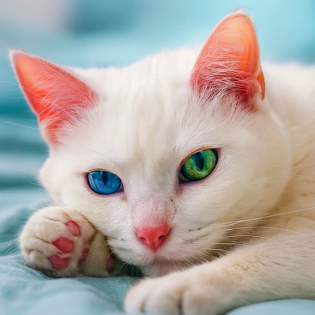 Далее номер телефона и цветная фотография. На фото была запечатлена абсолютно белая кошка, лежащая на спинке дивана. Глаза красавицы, обладающие гетерохромией, смотрели прямо в объектив камеры.