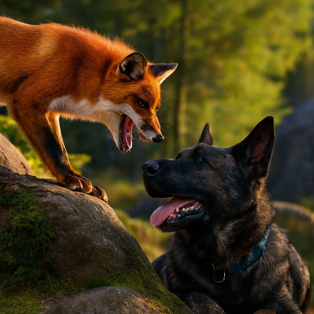 И те очень внимательно слушали её, а потом лиса отбежала немного подальше и стала показывать всем, что надо идти за ней. Лисята суетились тут же, явно увлёкшись собакой и котом.