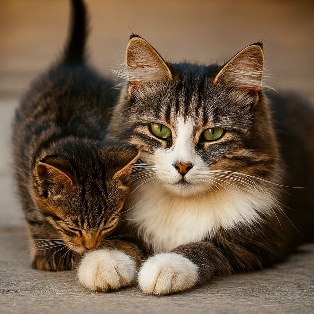 Во-вторых, неподалёку от них сидели кошки. Кошка-мама с котёнком, который жался к ней и со страхом смотрел на “страшных дядек”.
