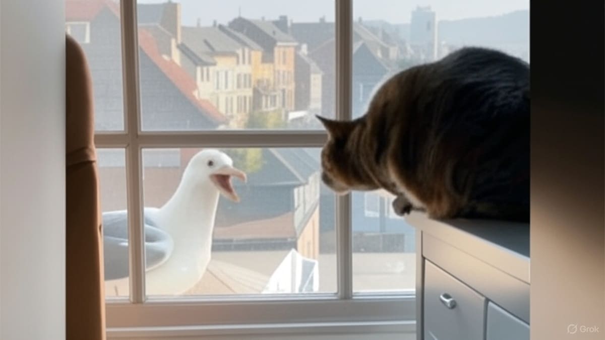 Чайки прилетели через день рано утром, но не кричали и не били крыльями. Наглая морда просто стучал в окно, а кошки мяукали.