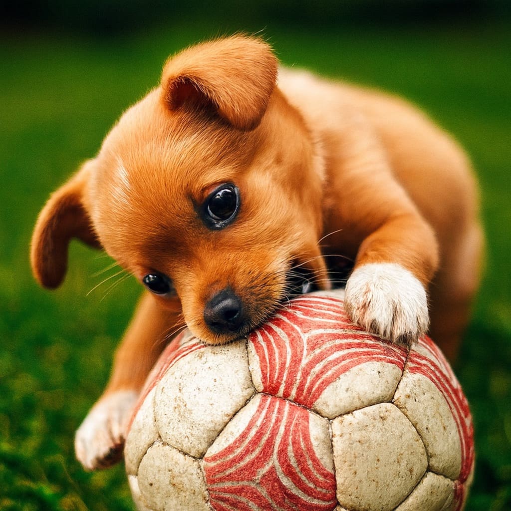 Никто не заметил, как к полю приблизился щенок. Мелкий, лохматый, он увидел мяч и весело побежал по полю. Щенок сам был не больше футбольного мяча, но как весело было бегать!